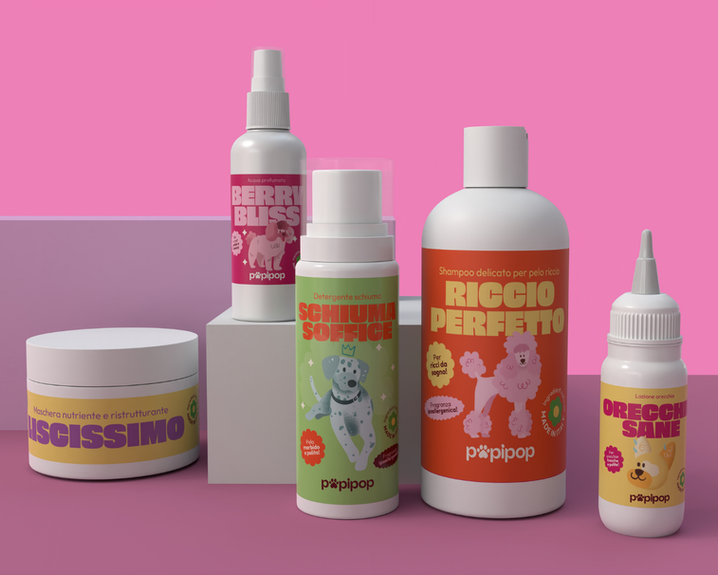 Popipop is a pet brand that embraces color, joy, and the love of caring for your dog, celebrating the happiness of being a dog owner. I worked on the full branding, from the visual identity to the packaging of 17 different products, building a vibrant and cohesive universe that stands out on the shelf.